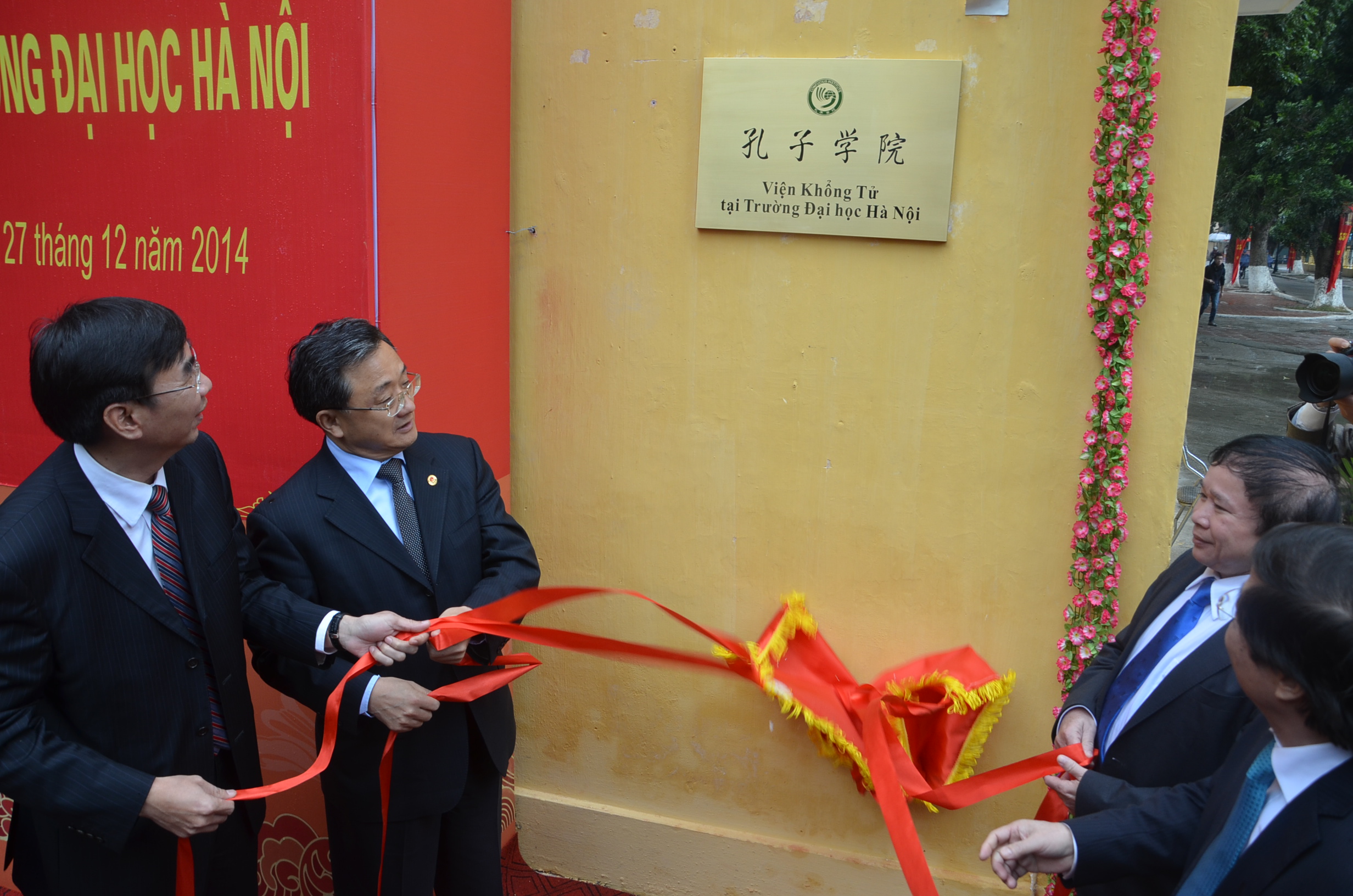 12月27日上午,代表团在越南河内大学参加了我校与河内大学合作共建的孔子学院揭牌仪式。在中共中央政治局常委、全国政协主席俞正声和越南祖国阵线中央委员会主席阮善仁的共同见证下,梁宏校长和中国外交部副部长刘振民、越南教育培训部副部长裴文歌以及越南河内大学校长阮庭论共同为孔子学院揭牌,使中越双方8年多共同努力筹办的越南首家孔子学院成功“落地”。