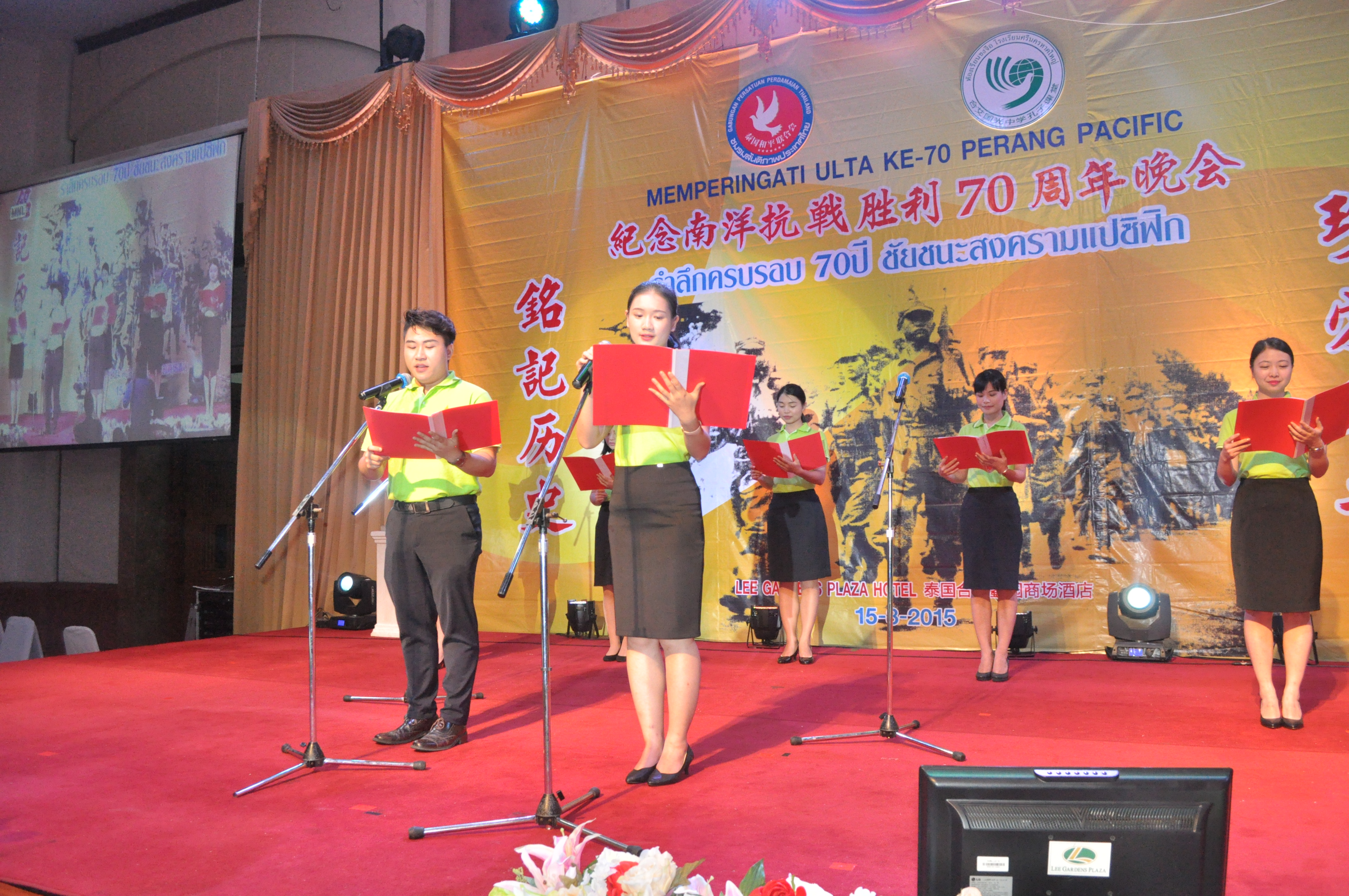 8月15日,由泰国和平联合会主办的南阳抗日战争胜利70周年晚会 (MemperingatiUlta KE-70 Perang Pacific)在泰国合艾蠡园隆重举行,宋卡王子大学孔子学院教师受邀参加本次纪念活动,此次活动旨在铭记历史、歌颂和平。
