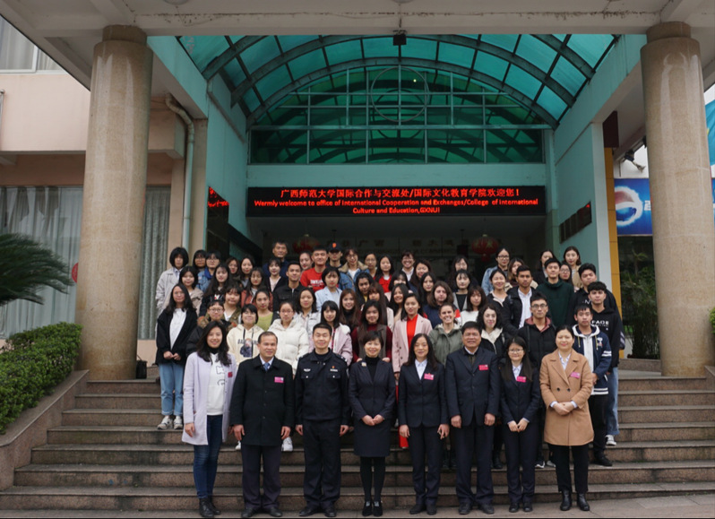 此次开学典礼,我们还特邀了桂林市公安局出入境管理支队郭涛警官就外国人在华法律法规、护照签证、出行安全等问题进行宣讲。