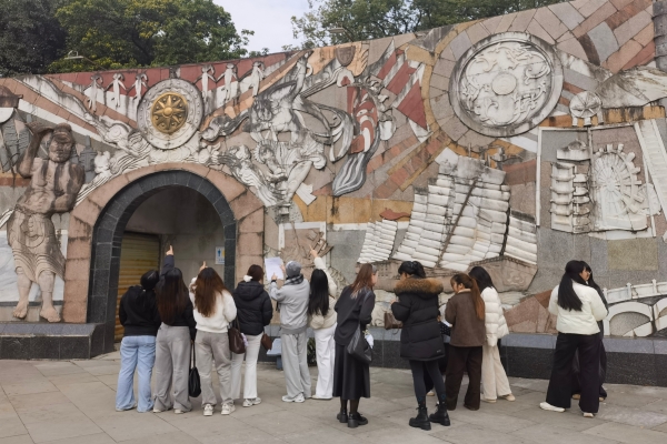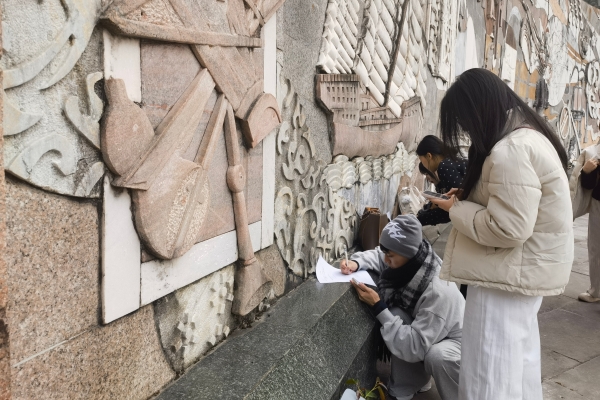 在40分钟的分组实践中,国际学生们穿梭于105米长的彩色花岗石浮雕壁画前,或驻足观察世纪宝鼎的纹饰铭文,记录香港回归的纪念意义;或探寻都江堰、灵渠的水利智慧,对比古今工具的发展变迁;或欣赏反弹琵琶、牵手舞蹈女子的艺术形象,描述浮雕的色彩与材质美感;或辨认龙舟竞渡、采桑等民俗场景,了解莲花的象征意义。教师们也在现场指导,及时为学生提供语言和文化知识支持,助力大家准确用汉语表达观察所得。