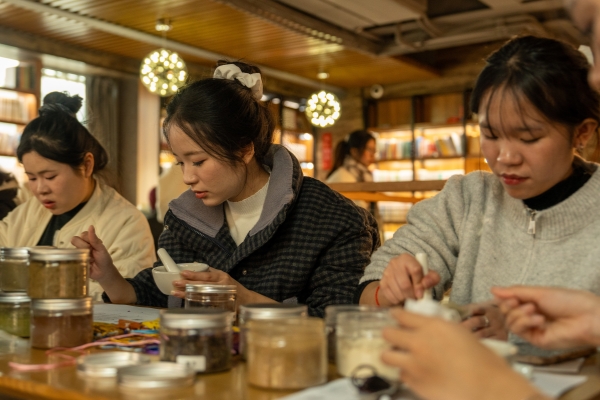 值得注意的是,本次市集中多项体验环节均由独秀书房阅读导师主导。民乐会由“月亮粑粑”话剧社市场负责人唐微娜带头编排;宋式点茶体验则由高级茶艺技师左慧梅现场教学,指导留学生与市民以茶为墨、在茶汤上书画创作;传统制香技艺体验由中国管理科学研究院香文化研究所特聘讲师雍利君和她的团队带领参与者制作香牌香囊。阅读导师们的深度参与,不仅保证了活动的文化品质,也体现了独秀书房“人文实验室”建设中“导师引领、体验浸润”的实践模式。
