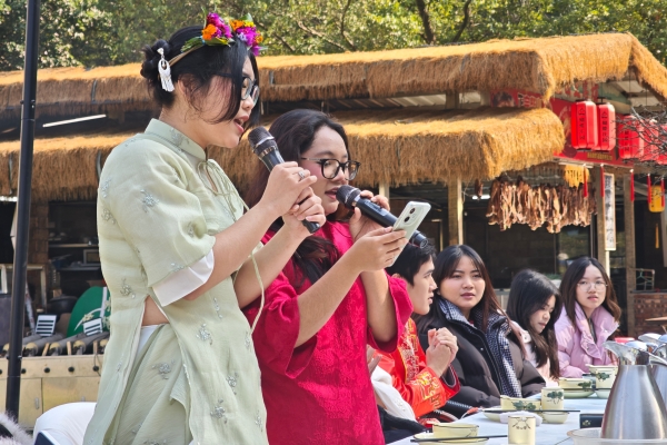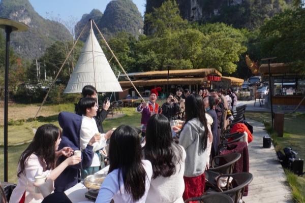 正午时分,蝴蝶庄园内长桌蜿蜒排布,一场不分彼此的长桌宴正式开席。留学生们在广西山歌王莫高阳老师的带领下复习《多谢了》《砍柴过岭又过坡》等经典曲目,还即兴改编《多谢了》歌词,将“阳朔摆起长桌宴,我唱山歌敬亲人”的谢意融入唱段。席间,莫高阳先生接连献上《美美阳朔故事多》《隔山隔水莫隔酒》等即兴山歌,留学生们拉歌互动,你唱我和,尽情释放对中华传统文化“刘三姐歌谣”的热爱。阳朔文联负责人表示:“山歌是不用翻译的语言,‘刘三姐歌谣’的韵律跨越高山与国界,织进了中国与东盟的文化联结里,成为中外青年民心相通的共同记忆。”