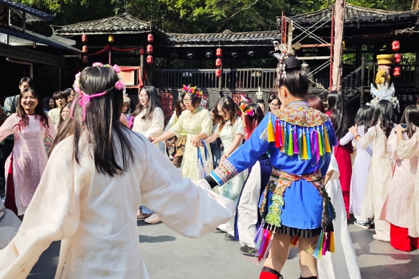 随后,侗族大歌专场演出在景区内开演。身着盛装的侗族歌师演绎非遗韵律,留学生们聆听歌师讲解侗族文化渊源,感受服饰银饰的精致,与歌师共舞。镜头里的多元服饰与同步笑意,成了文化共通的生动注脚。