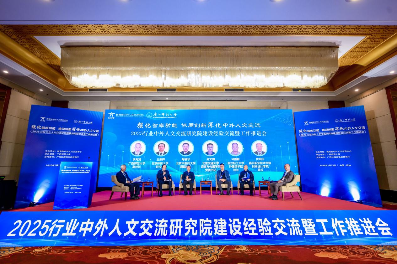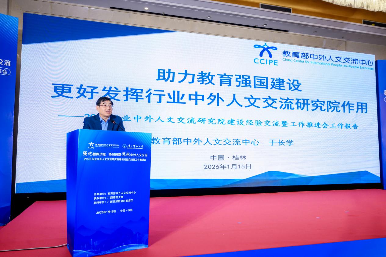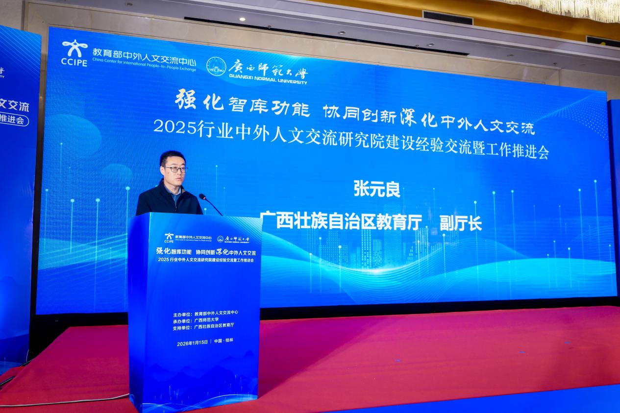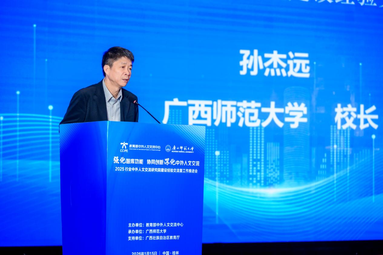 为深入贯彻关于深化中外人文交流、扩大教育对外开放的决策部署,1月15日,由教育部中外人文交流中心主办的2025行业中外人文交流研究院建设经验交流暨工作推进会在桂林市顺利召开。本次会议以“强化智库功能,协同创新深化中外人文交流”为主题,由教育部中外人文交流中心主办,广西壮族自治区教育厅支持,广西师范大学承办。教育部中外人文交流中心主任于长学,广西壮族自治区教育厅副厅长张元良,广西师范大学校长孙杰远,来自全国多所高校、科研院所、教育行政部门及中外人文交流特色学校的120余代表参会。