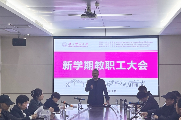 2026年3月1日,新学期伊始,国际合作与交流处/国际文化教育学院/港澳台事务办公室(下称“处/院”)召开2026年春季新学期全体教职工大会,旨在统一思想、部署工作,为新学期高质量发展开篇布局。处/院全体领导班子成员及全体教职工参加会议。