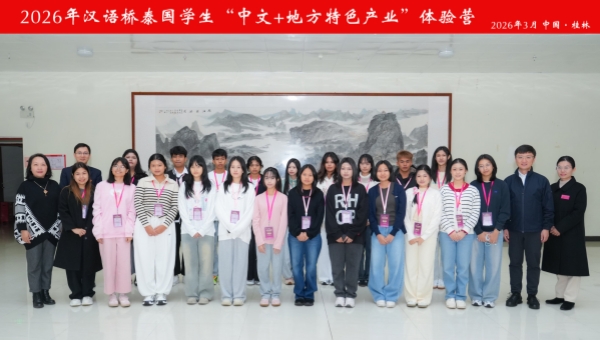 3月20日上午,由广西师范大学与柳州城市职业学院联合主办的2026年“汉语桥”泰国学生“中文+地方特色产业”体验营开营仪式在广西师范大学育才校区国际教育交流中心2号楼举行。21名泰国师生齐聚桂林,正式开启为期12天的沉浸式中文学习、产业探访与文化交融之旅。