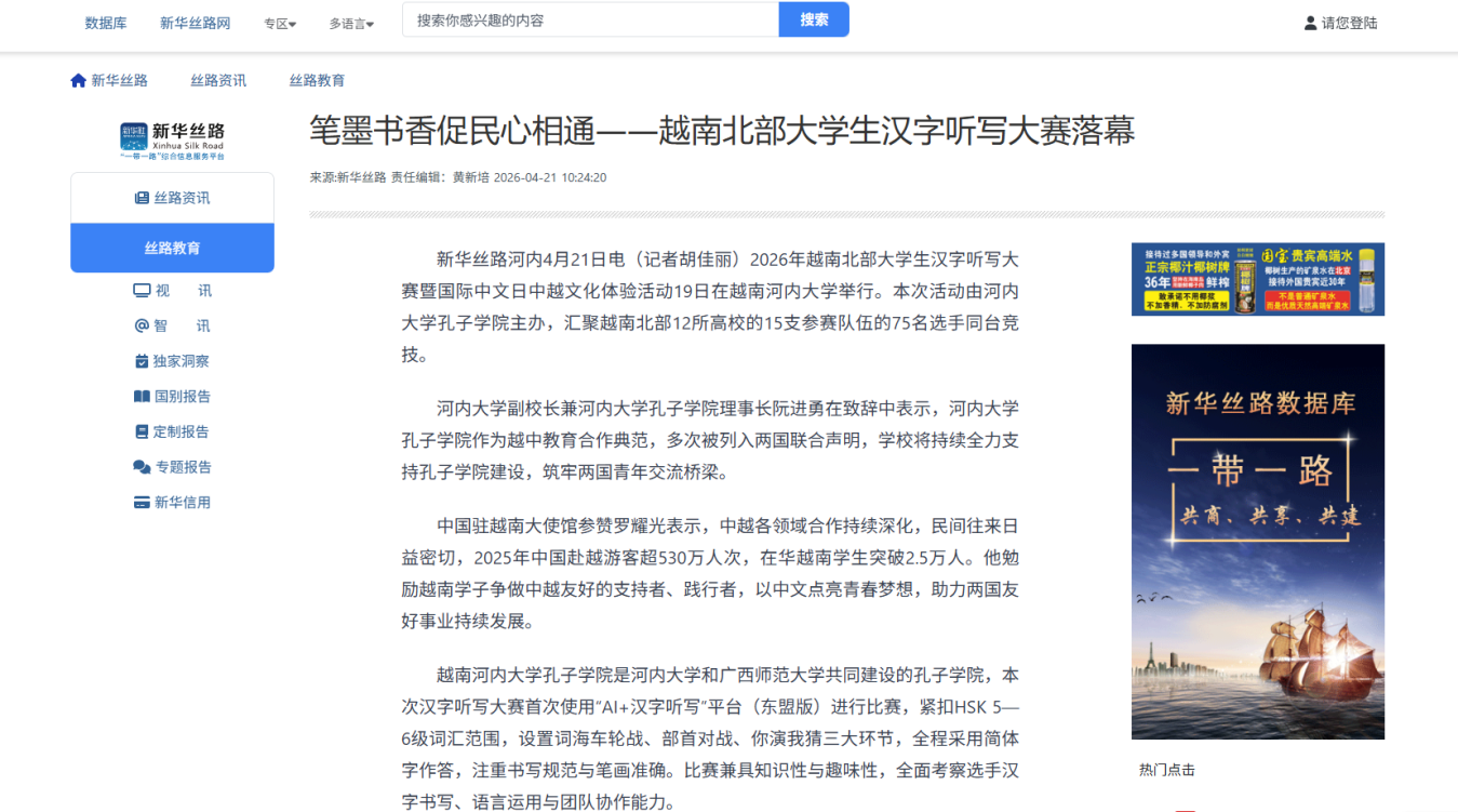 4月19日,【人民网】【新华丝路】关注报道我校与越南河内大学共建的孔子学院在越南河内大学隆重举办2026年越南北部大学生汉字听写大赛暨国际中文日中越文化体验活动。本次活动以“AI+汉字听写”创新平台为特色,汇聚越南北部12所高校的75名选手同台竞技,设置词海车轮战、部首对战、你演我猜三大环节,并同步开展中越文化体验活动。中国驻越南大使馆参赞罗耀光、河内大学副校长阮进勇出席并致辞。活动恰逢国际中文日和广西“三月三”节庆日,是深化中越语言文化交流、推动青年心灵相通的重要载体,也是我校服务国际中文教育、促进中华文化海外传播的生动实践。